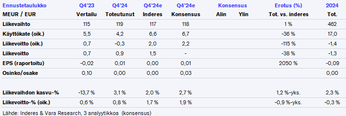 Suominenâs result, similar to Q3, fell short of the previous year, even though expectations were (again) higher. However, the explanation had changed; instead of Q3âs operational problems, tighter competition and rising raw material prices were now lamented. At the full-year level, they again just barely reached the guided improving adjusted EBITDA, but at the operating profit level, losses were made for the third consecutive year. The dividend was cut to zero as expected, given the losses and a tightening balance sheet. The guidance is again for an improving adjusted EBITDA in 2025, but forecasts will likely have to be cut once again.