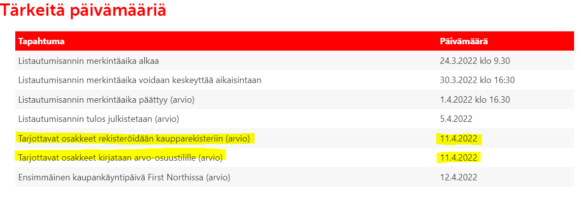 Listautumisannin merkintäaika voidaan keskeyttää aikaisintaan 30.3.2022 klo 16:30