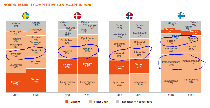 Muissa pohjoismaissa Synsamilla on isompi osuus markkinasta ja ottanut markkinaa itselleen vauhdikkaammin verrattuna GrandVisionin liikkeisiin. Suomi kuitenkin toistaiseksi pienin markkina-alue Synsamille, mutta Ruotsin lisäksi ainoa maa, jossa myynti on kasvanut 19-20: