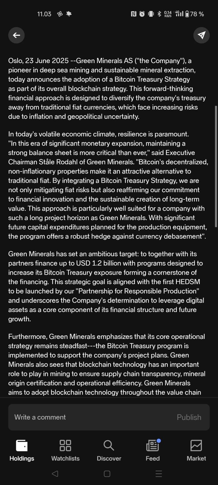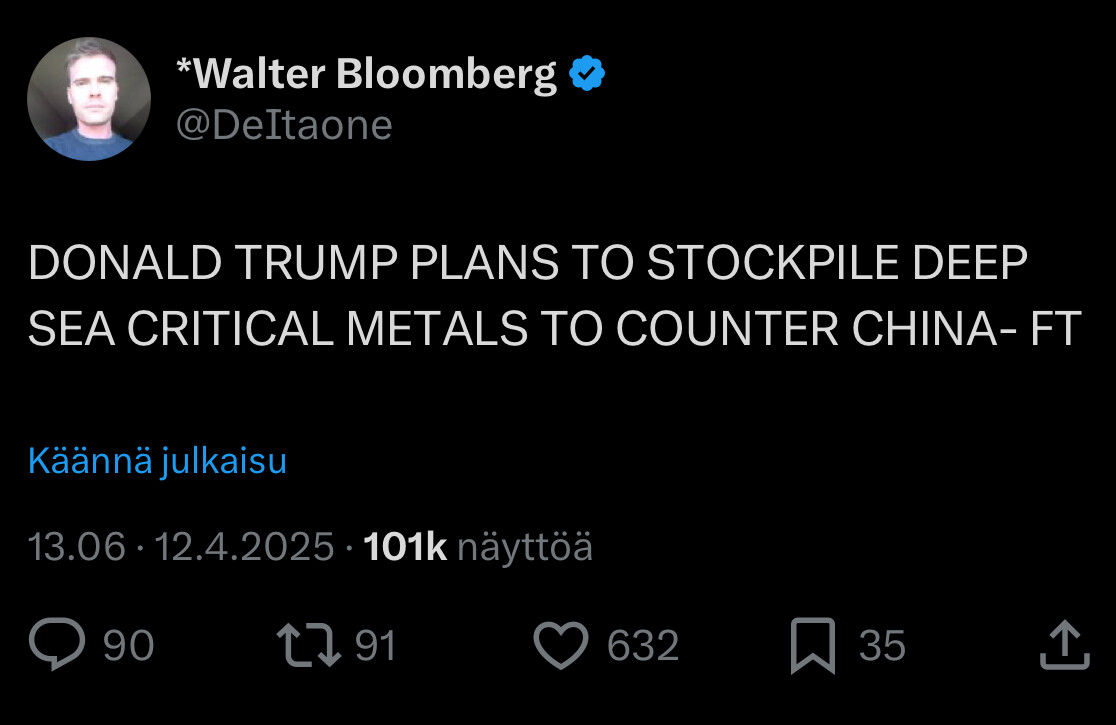 I Yles nyheter klockan halv nio idag verkade det också ha funnits ett inslag om djuphavsmineraler. Enligt min mening var produktionen av inslaget ganska svag både tekniskt och med faktamässiga fel, bara genom att lyssna med ett halvt öra. Nyhetens huvudsakliga argumentation var ganska neutral och lyfte fram USA:s och Trumps vilja att gå emot FN:s avtal. I inslaget nämndes (om jag hörde rätt) att 38 länder, inklusive Finland, har ratificerat ISA:s avtal om havsbottenresurser. USA betonades naturligtvis som motpart. Kina, Japan eller andra DSM-aktörer nämndes inte. I inslaget intervjuades två finska experter. Den senare nämnde miljöaspekterna som också diskuterats här på forumet. Som exempel nämndes areans funktion mellan terrestrisk gruvdrift och nodulinsamling. Som nämnts är det stor skillnad mellan att gräva nedåt och att bara gå på ytan, när det gäller hur mycket denna operation belastar miljön. Samtidigt glömdes det dock bort att nämna att på 5-6 km djup är biomassan per m2 gram. Vanligtvis hänvisas till siffran 5-10g/m2. Samma värde i regnskogen är 20-50kg/m2. Och detta är en jämförelse endast utförd som en funktion av biomassa. Det finns dock tiotals sådana mätare, vilket bevisar att ärendet är mycket komplext. En annan sak som rapporteringen inte alls lyfte fram är ISA:s misslyckande att genomföra sin egen regleringsprocess genom att inte kunna ge ett godkännande eller avslag inom den 2-åriga tidsfristen till TMC (eller andra aktörer). I inslaget berättades det visserligen att ISA:s förra möte präglades av mycket motsägelsefulla stämningar.
