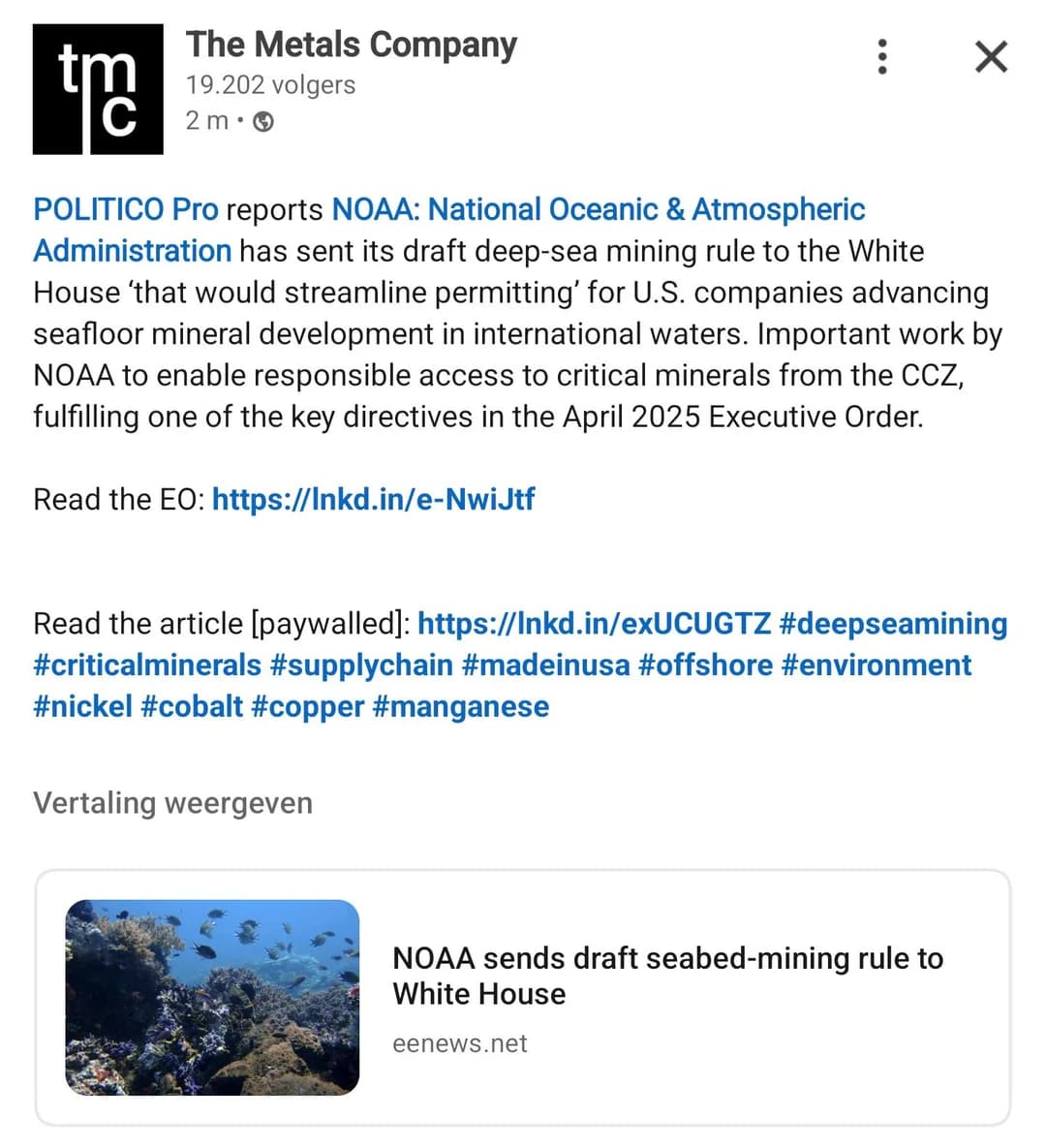 I sig är det redan gammal information för det senaste rallyt. Bakom det senaste dagarnas rally har det funnits en möjlig buy-in från den amerikanska administrationen i TMC. Administrationen har redan köpt delar av några andra företag i värdekedjan för kritiska mineraler. TMC skulle vara en fortsättning på det.