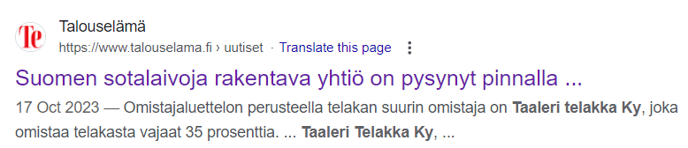 Googlella näkyi tällainen Taaleri Telakka Ky haulla