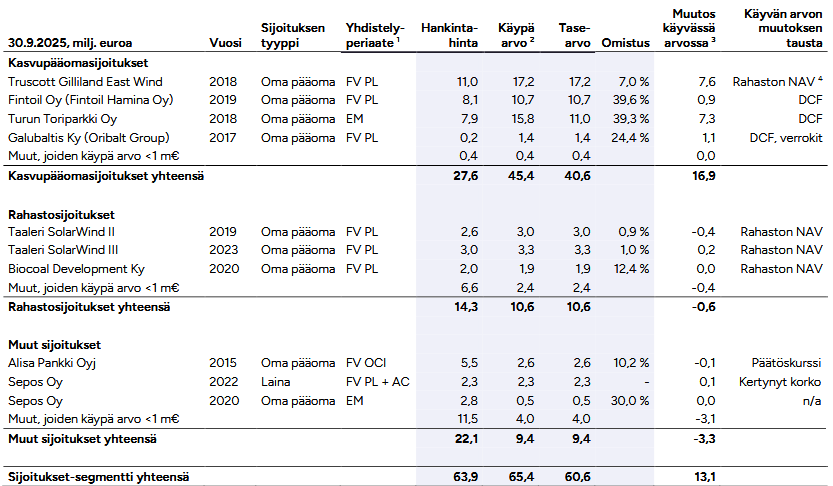 Sijoitukset on myös esitelty yksityiskohtaisemmin.