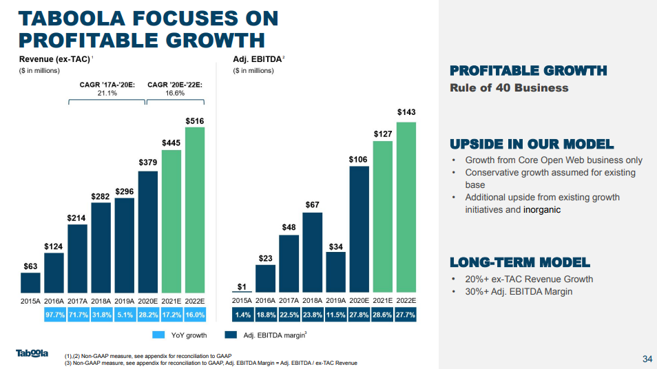 Taboola on monista SPACeista poiketen valmiiksi kannattava, vapaa kassavirta positiivinen ja kasvuluvut hyvällä mallilla. Valuaatio sijoittajamateriaalien pohjalta edullinen 10$ oletushinnalla: