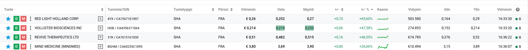 Onks se tuo alla oleva uutinen vai mikä noita nostaa? Anyway, tänään koko Degiron salkku plussalla 14%, kun suurin omistus Mind Medicinessä viimeaikaisten nousujen takia. Tänään tuli otettua avauspositio myös Red Light Holland Corp, joka myös kivasti +70% tällä hetkellä.