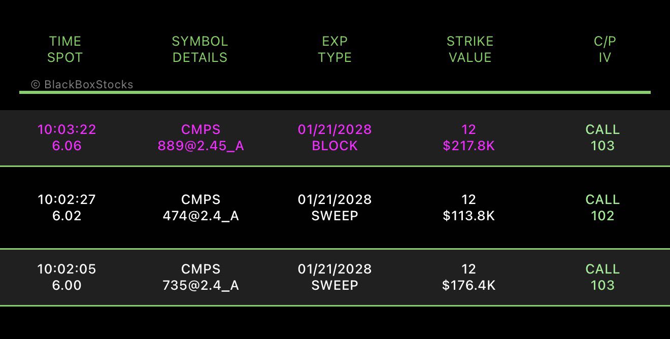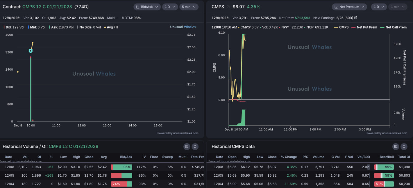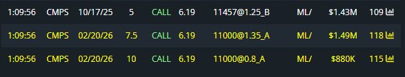 For example, a CMPS Call $12 was opened a moment ago, which expires on 21.1.2028, and the bet is $749K. I personally followed this with a small stake, which gives me an interest in researching the field more closely. Based on experience, someone has (better?) (insider) information about mergers, results, regulatory changes, agreements, and/or some significant catalyst. For me, this is a pure trade, for now, and I don’t know the field. However, all means are desirable in the treatment of severe depression, and I hope they succeed in getting the medicine to market.
