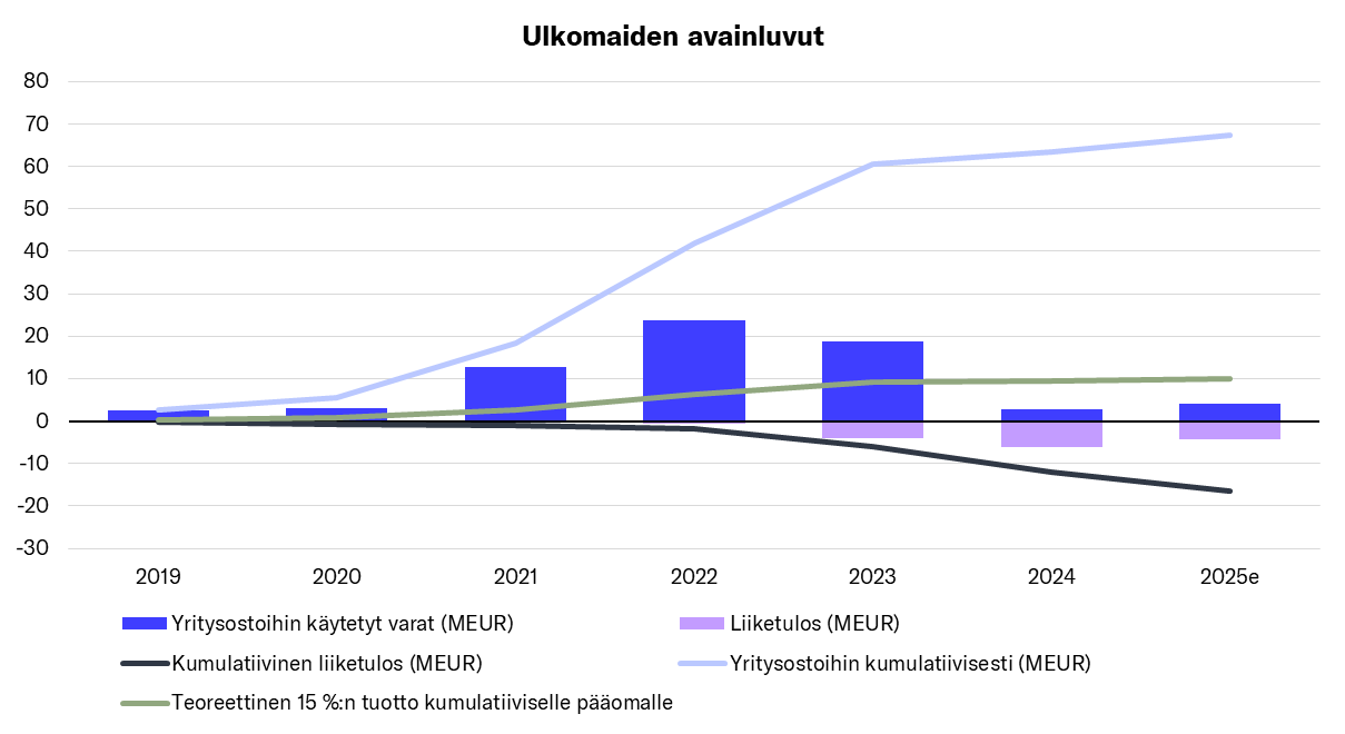 Talenom has invested almost 70 MEUR in acquisitions abroad since 2019 (including 2025e). In practice, this has gone to Sweden and Spain, and a little to Italy. The exercise is furthest along in Sweden, and the results so far are the worst.