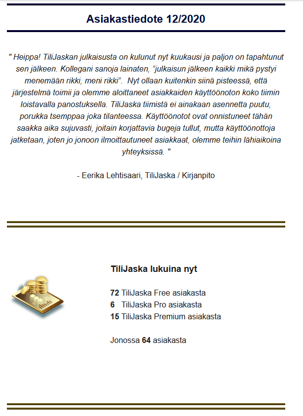 Itse uskon että TiliJaska lähtee lentoon. Aiemmin ei Talenomilla ole ollut kunnon tuotetta pienasiakas ryhmään.