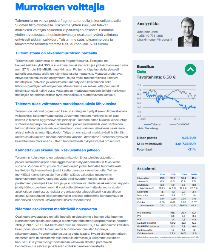 Ajankohta oli loppuvuosi 2016 ja olin tuolloin selaillut pintapuolisesti Juhan Talenom-raportteja. Inderes oli ylipäätään vielä mulle aika uusi juttu ja olin ollut käyttäjänä varmaan vasta kuluneen vuoden ajan. Oma osaaminen analyysistä oli myös aika paljon huterampaa kuin nykyisin, koska olin ollut edelliset vuodet rahasto-/ETF-sijoittaja, ja ensimmäiset suorat osakkeet oli napattu salkkuun vasta alle pari vuotta aiemmin.