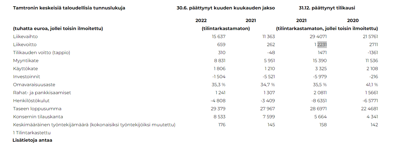 Tamtronin listautumisesitteen mukaan tilikaudella 2022 käyttökate tulee olemaan 4,68 miljoonaa euroa.