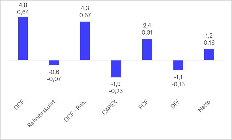 Tein oman laskelman yhtiön rahavirtaprofiilista vuoden 2026 ennusteilla. Ennusteen mukaan osinkoa maksettaisiin noin puolet vapaasta rahavirrasta (FCF: 2,4 MEUR tai 0,31 €/osake), jolloin velkojen lyhennyksiin tai yritysostoihin jäisi noin 1,2 MEUR (0,16 €/osake). Ennuste olettaa käyttöpääoman osalta, että nettokäyttöpääoman ja liikevaihdon suhde kasvaa 15,1 %:iin (2025: 14,9 %), joten sikäli ennuste on rahavirran osalta suhteellisen maltillinen.
