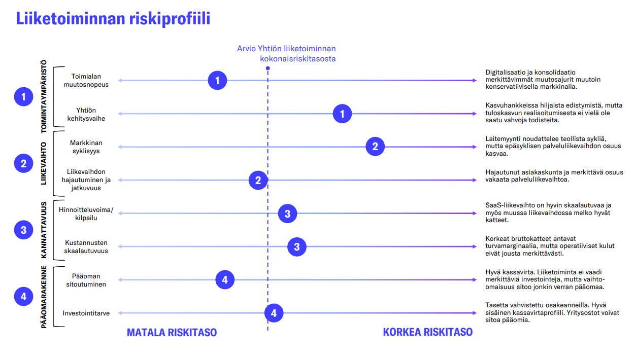 Vi förutspår att de organiska investeringarna kommer att vara 1,9-2,2 MEUR/år 2026-30, vilket är i linje med vår prognos för den normala avskrivningsnivån. Enligt vår bedömning har företaget för närvarande inget behov av att öka capex-investeringarna, så den förväntade vinsttillväxten kommer att visa sig som en tydlig ökning av det fria kassaflödet. Investeringarna kan på kort sikt till och med minska efter att ERP-projektet slutförts och mScales-utvecklingen eventuellt effektiviseras med AI. De immateriella avskrivningarna relaterade till företagsköp uppgår i våra prognoser till 2,3 MEUR under 2026e, men sjunker till 1,5 MEUR under 2030e, förutsatt att företaget inte genomför nya företagsköp.