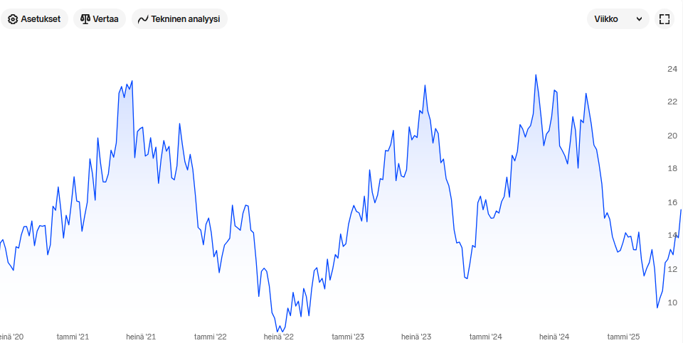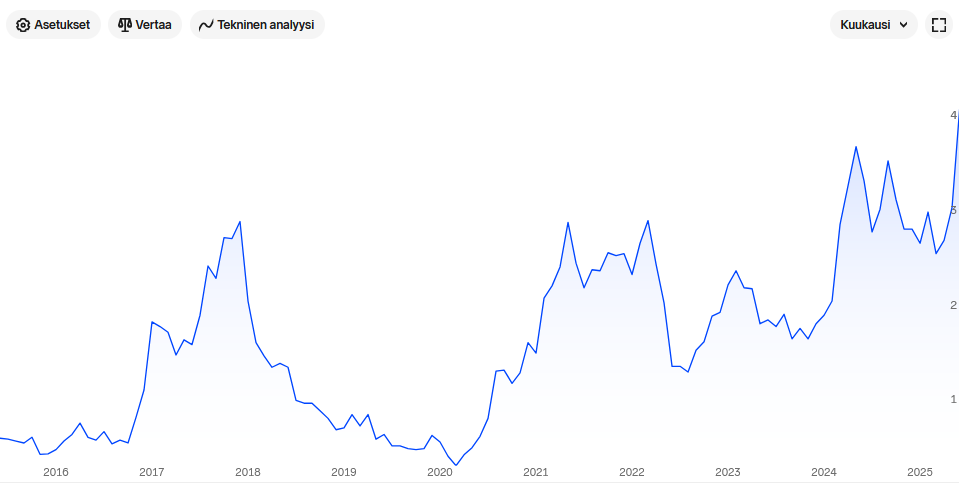 -Kupariyhtiöiden osakkeet ovat olleet hyvä puntari maailmantaloudesta. Esimerkiksi Ero Copperin osake on mennyt käytännössä taantumapelkojen kanssa käsi kädessä edelliset vuodet ja se on jättänyt pohjat taakseen jo kauan sitten samalla kun maailmantalous näyttää jatkavan tullisodasta huolimatta ihan hyvää vauhtia.