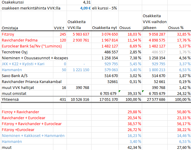 Thanks. And most importantly, the number of shares obtained with the convertible bond is naturally 175,747 ÷ 20 = 8,787 shares. But since the split-adjusted share price is lower than the price cap of €0.569, one gets 24,115 shares with the convertible bond at the current rate, meaning a total of 431 x 24,115 = 10,393,681 new shares. If I remember correctly, the number of shares was rounded down to the nearest integer according to the terms. If the conversion of new shares were to happen at the current rate, the ownership stake of Fitzroy, Padma, and Hammaren in the company, including existing shares, would be 62.49% (Fitzroy 43.1%, Padma 14.5%, and Hammaren 4.89%).