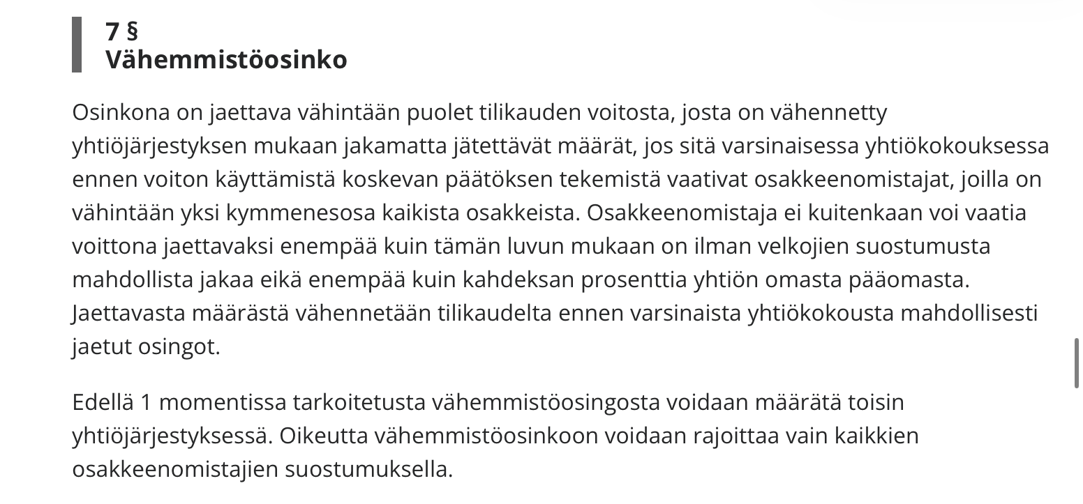 | Regnskabsår | Moderselskabets resultat (MEUR) | Egenkapital 31.12 (MEUR) | ½ af resultatet (MEUR) | 8 % af egenkapitalen (MEUR) | Maksimalt minoritetsudbytte (MEUR) |