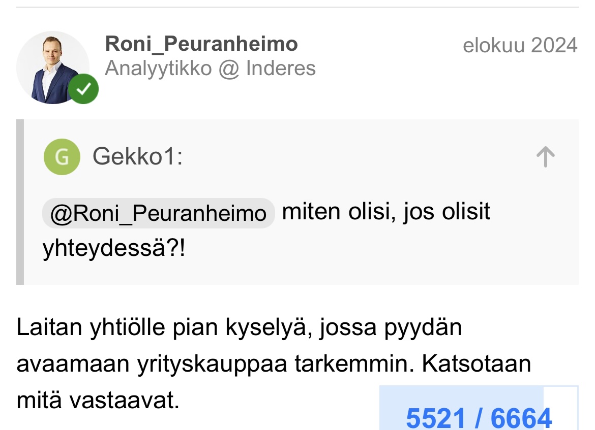 Samaa mieltä tässä @Lenheeti ja @Seinakadun_Keisari kanssa. Kun uutta informaatiota tai riskejä tulee esiin, on mielestäni selvää, että ne pitää hyödyntää analyysissä. Tärkeää on luonnollisesti yrittää filtteröidä laadukas sisältä ja perusteeton spekulaatio. Se että yhtiö aikoinaan reagoi ”kohuun” nopeasti tekemällä kanssamme videon sekä järjestämällä sijoitustilaisuuden viestii mielestäni siitä, että yhtiökin tajusi tuolloin itsekin, ettei tiedottaminen esim. Pericius-kaupan suhteen mennyt ihan niin kuin piti. Niissä yhtiö pyrki avaamaan foorumilla ”kohua” aiheuttaneita teemoja, joten ei kai ne ihan perusteettomia kirjoituksia olleet. Toki analyytikkona foorumikirjoituksia pitää tarkastella objektiivisesti ja olla lähtemättä mukaan laumahenkeen ja viime vuonna pyrinkin hieman kohun jälkeen rauhoittamaan tunnelmaa täällä foorumilla. Mutta en väittäisi, että analyysi reagoi vain puhtaasti foorumikirjoitukseen, (vaikka se olikin tilanteelle katalyytti) vaan myös omaa tutkimusta tehtiin ja muitakin informaatiolähteitä mahdollisuuksien mukaan pyrittiin tilanteessa hyödyntämään.