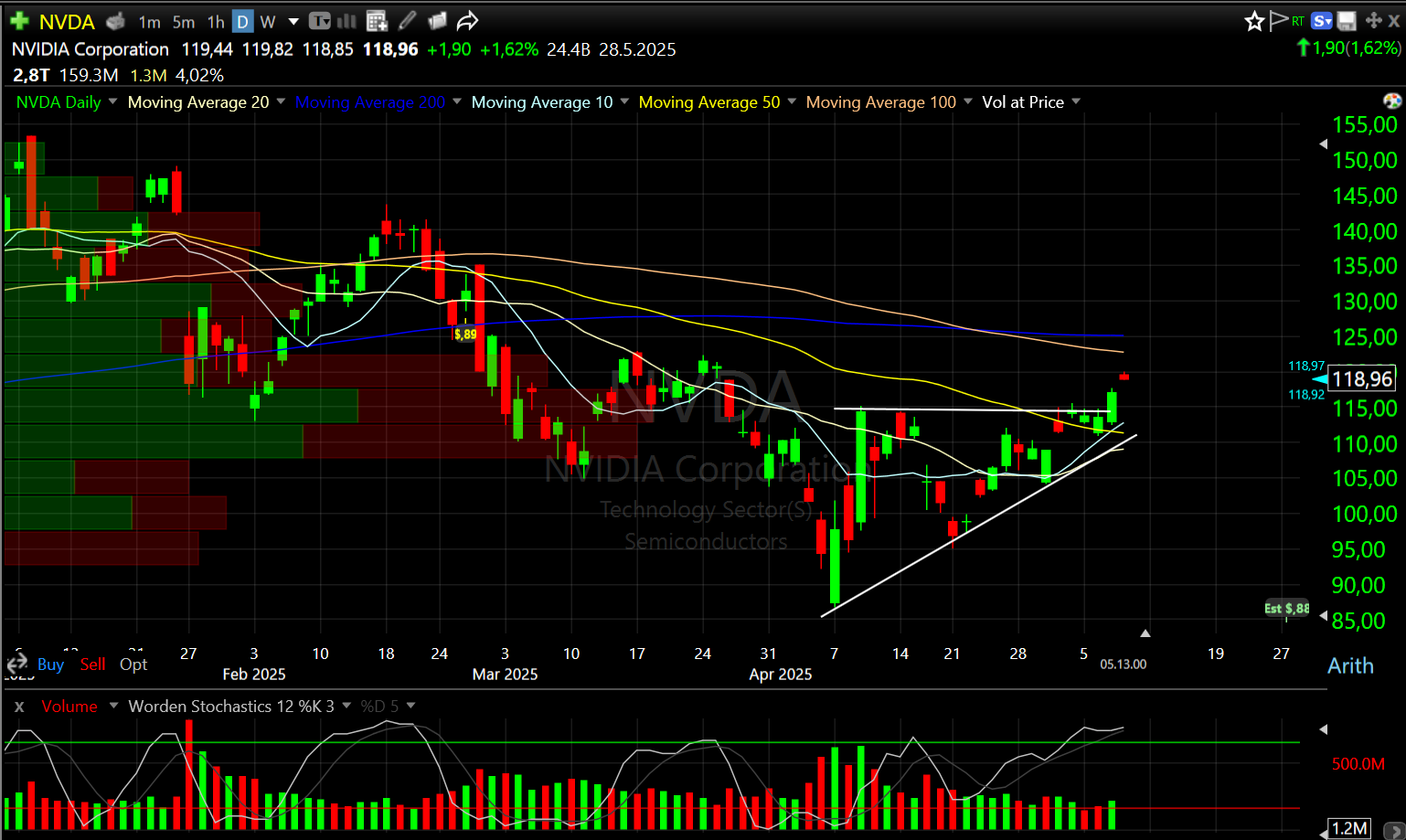 NVDA poistui Volatility Contraction Patternista ja menossa testaamaan maaliskuun huippua alueella 122-123$. Pidemmät liukuvat myös lähellä vastassa. Jos siitä päästään olisi latu auki??