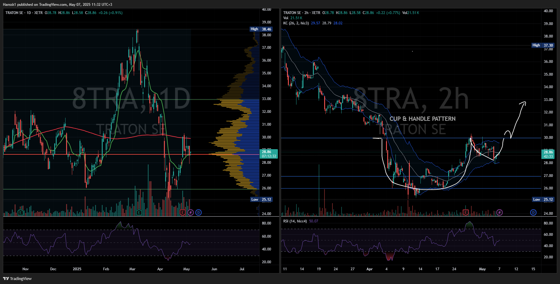 Tuossa Tratonin osakkeessa tekee paljon tuo kun ei ole Freefloat kuin 12,47% niin tekninen analyysi ei ole helpoin kun volatiliteettia on paljon ja tarkat taso ei olekkaan tarkkoja, niin itse silloin seuraan mieluummin enemmän volyymi pohjalta osakkeen tasoja, huomasin vain myös tuon C&H niin ajattelin raapaista pienen tekstin.