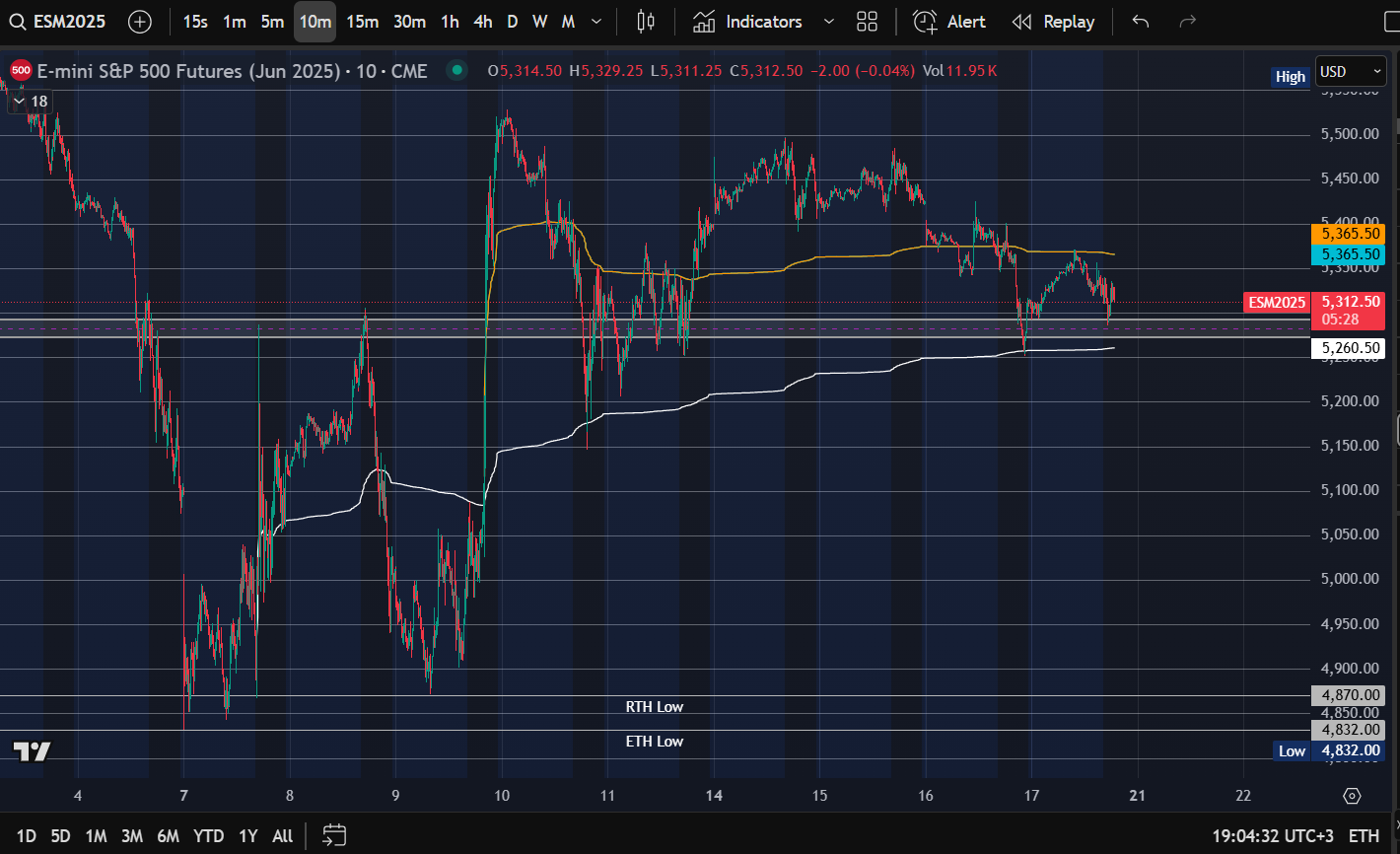 VWAP paikkaa mitkä itsellä seurannassa ES on tuo Ma 7.pvä RTH low (valkoinen) sekä Trump Ke 9.pvä (oranssi) Tätä kirjoittaessa ES kirraa nuiden kahden välissä.