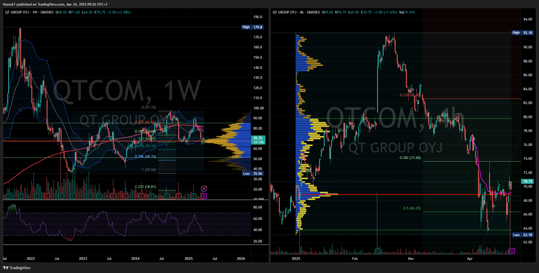 Minusta on helpompi katsoa tukitasot volume profile:sta varsinkin tällaisessa osakkeessa jossa vaihdettavien osakkeiden määrä on rajallinen ja hinnan heilunta on suurta ja pelkästään hinnasta katsoen tukitasot on vaikea löytää, muutenkin vaihto määrät eri hintatasoilla kertoo huomattavasti enemmän kuin että missä hinta on käynyt hetkellisesti, itselle ainakin.