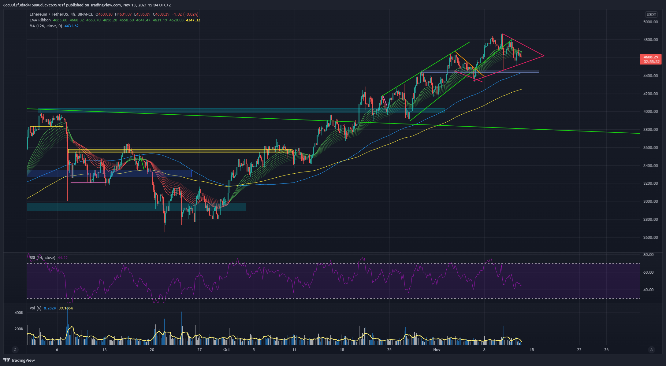 Bitcoinin 4h kynttilöillä havaittavissa suosikkikuvioni eli kolmio, johon on tultu nousutrendistä, voisi ehkä olla mahdollisuus breikata ylös kohti edellisen ath:n lukemia…