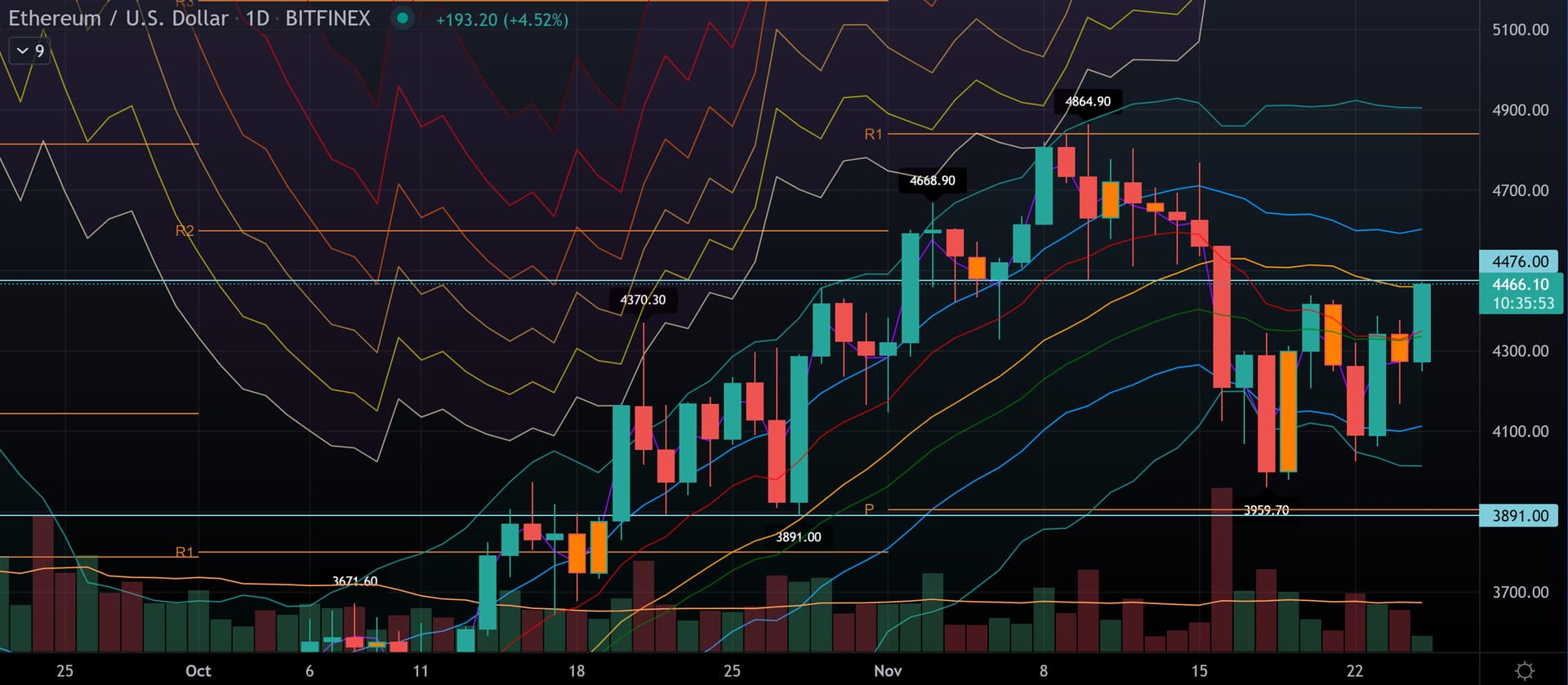 Erittäin bullin näkökulman ohella voisi ajatella myös karhumaista skenaariota, jossa kurssi vielä korjaa reilusti alemmalle tasolle ehkäpä juuri 21dMA:lle. Eri välittäjien volyymia tarkasteltaessa, tässä viimeisessä elokuusta alkaneessa nousussa, ei volyymi ole osoittanut vastaavaa retailien hurmiota, kuin viime syksynä. Ehkä kysyntä on tullut enemmän instituutiopuolelta?