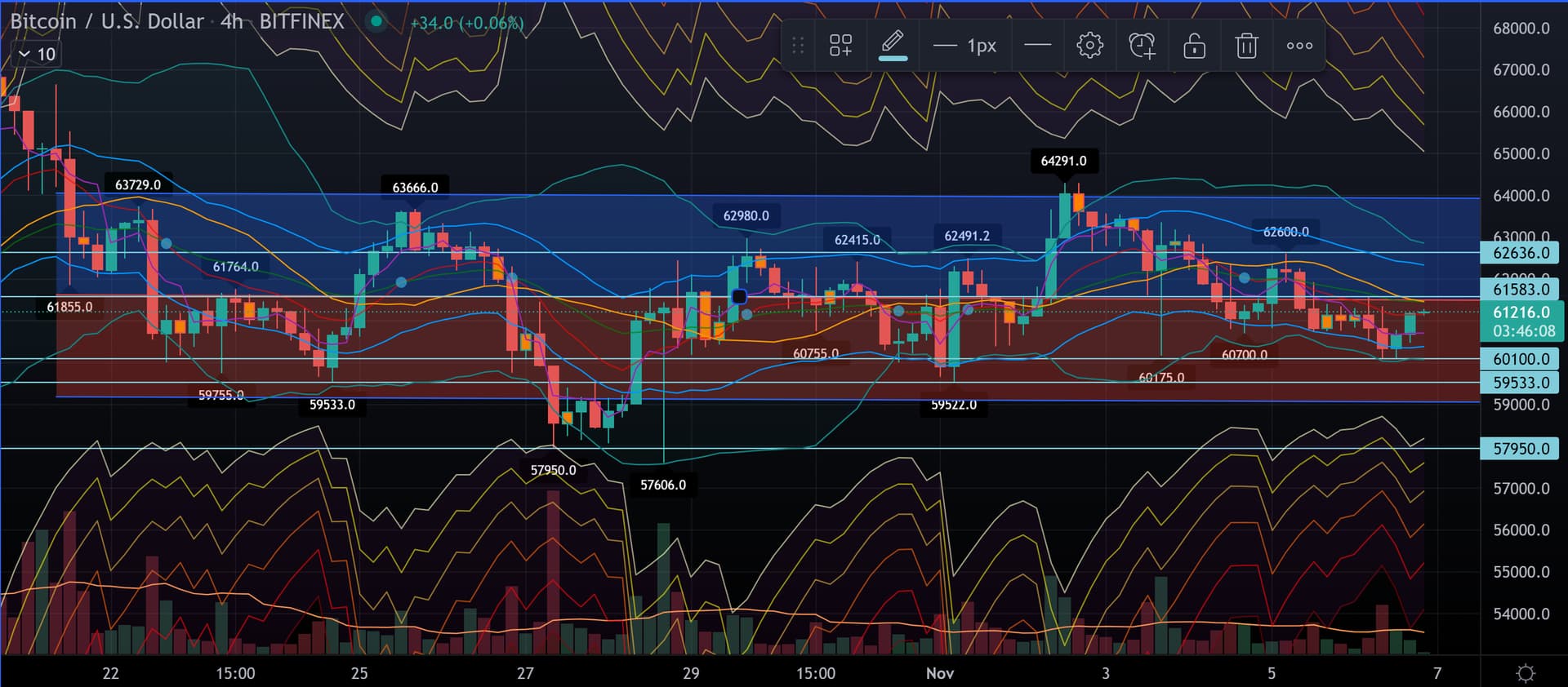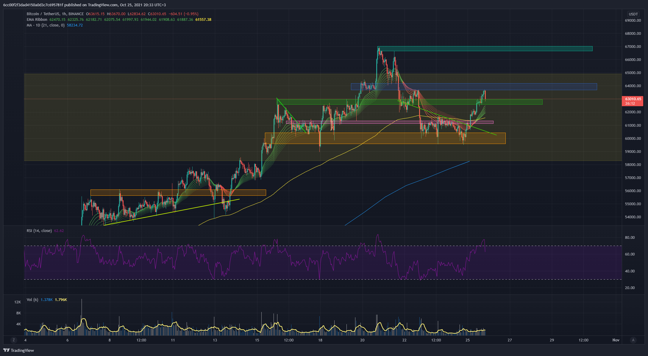Näin uuden ketjun kunniaksi omat Bull Mentulaakin bullimmat näkemykset BTC:n kynttilöistä. Oikeastaan 1h kynttilät näyttäisivät RSI:n pohjalta erittäin mielenkiintoisilta. 63700 usd tasolla törmättiin siniseen resistanssilaatikkoon, joka aikaisemmin on tukenut ja vastustanut kurssia. RSI on tunnin kynttilöillä melkein 80, josta on korjattu hieman alaspäin. Yleensä tälläiset luvut tunnin RSI:lle ovat näyttäneet toppia yliostetun markkinan alkaessa tasaantumaan.