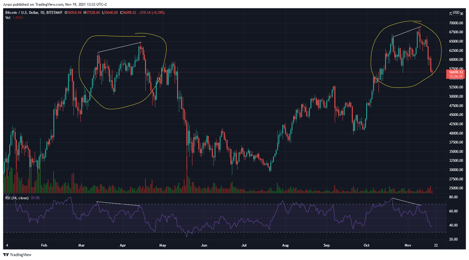 Pitäisin erittäin bullina viikosta pariin viikkoon kestävää korjausliikettä, jossa suurin myyntipaine on jo nähty. Tämähän olisi varsin normaalia uusien ATH lukemien jälkeen. En tällä tarkoita mitään yhtenäistä alamäkeä vaan tasaista heilumista edellisten pohjien (57k usd) yläpuolella ja ehkä korjauksen päätteeksi uudestaan 5:llä alkavien lukujen testausta, josta sitten momentumia keräillen kohti uusia ath lukemia.