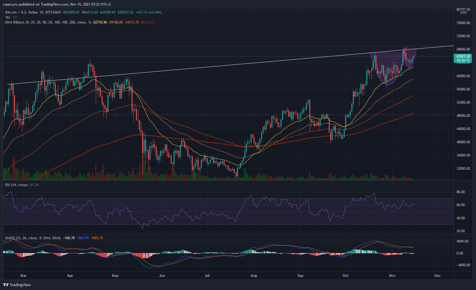 Seuraavaksi vastustasona edellinen ATH eli 67000 usd hintataso.