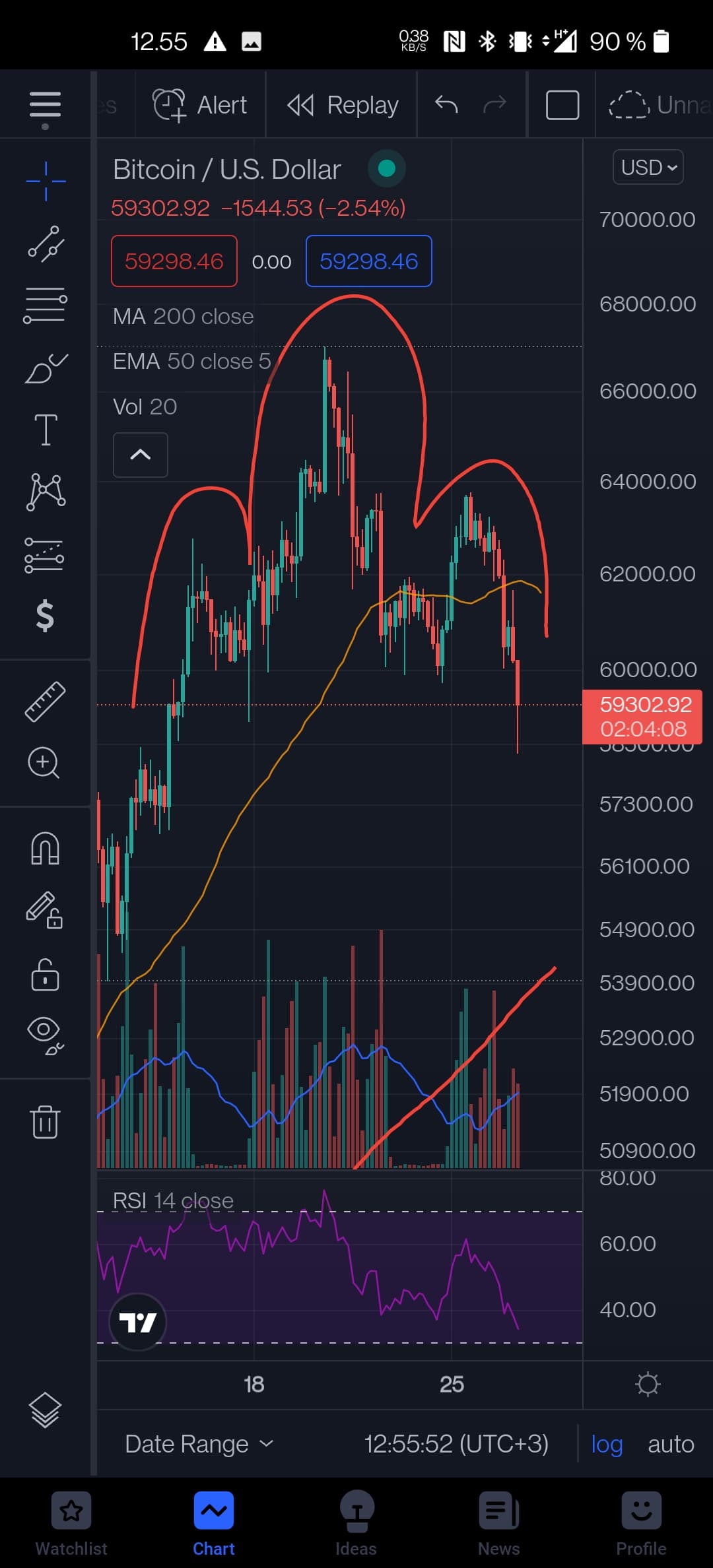 Helpottaisi, jos näkisi timeframen, mutta näyttäisi 4H:lta. Liian epäselvä mielestäni. Selvää kuitenkin on se, että daily support 59533 (Bitfinex) meni rikki ja siirryttiin daily down trendiin eli weekly consolidation edessä. Käytiin nippa nappa 4H OS, mutta sitä seurannut pomppu on toistaiseksi hyvin heikko. Lisäpudotus on mahdollinen, hourly on bear flag. Tarvittaisiin 15min TC (trend change) ja ema12 breakout seuraavaksi.