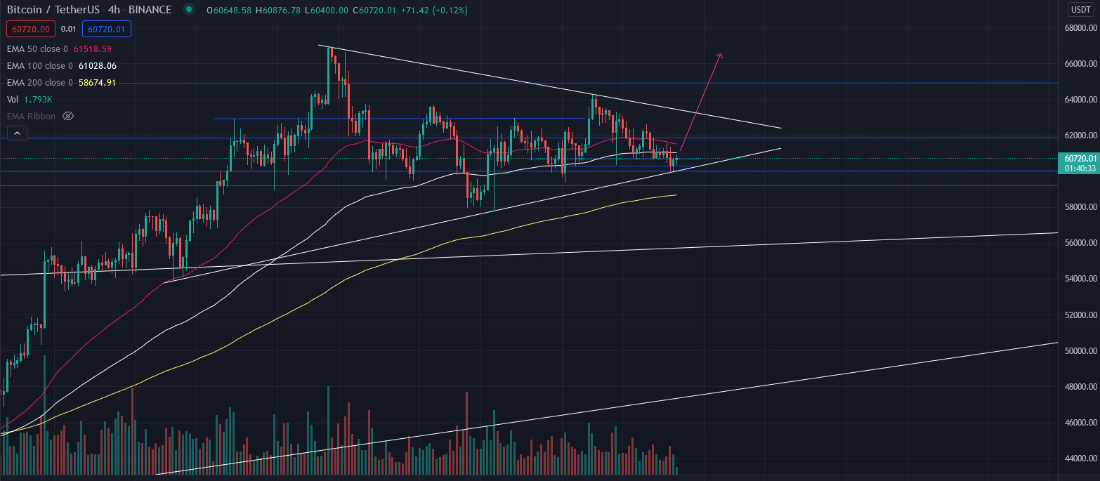1h bull flag potentiaali edelleen hengissä mikäli ~$62,5K tasolle muodostunut low pitää ja ~$63K taso ylitetään selkeästi. 1h uptrendissä ollaan vielä toistaiseksi selvästi.