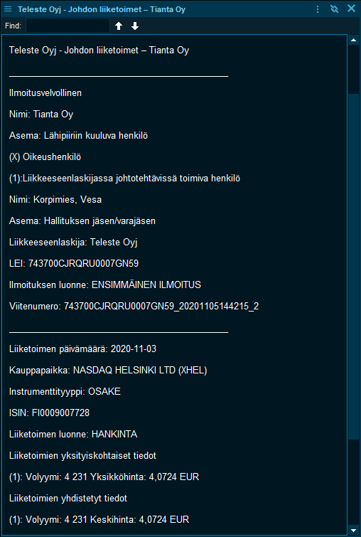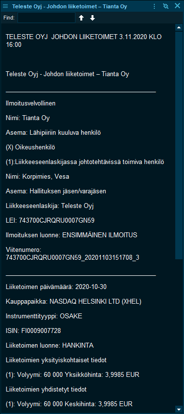 Aina positiivista, että johto näin osoittaa luottamuksensa liiketoiminnan tulevaisuutta kohtaan. Osake näyttää saaneen hyvin nostetta Q3-raportista, vaikka varsinaista käännettä myynnissä saadaan edelleen odottaa. Hajautetun verkkoarkkitehtuurin testaukset ovat viivästyneet koronan takia. Kun ottaa huomioon toisen aallon viimeaikaisen kehityksen Telesten päämarkkinoilla, niin toimitusten lykkääntyminen taas kerran kauemmas tulevaisuuteen ei varmaan olisi suuri yllätys?