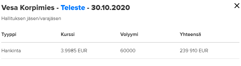 Telesten osalta askarruttaa USA:n markkinoille pääsy. Indereksen Q3 yhtiöpäivityksessä ko. seikkaa painotettiin melkoisesti - mm. Telesten 2021 kehityksen kolmessa skenaariossa heikko, normaali ja vahva. Viimeksi mainittuun liittyy tärkeänä tuo USAn osuus Telesten bisniksessä, mutta toistaiseksi edistysaskelista ei ole saatu kuulla. Ja USAn näkymäthän eivät ole ilmeisesti järin otolliset, kaaoottiseksi kehittyvä korona-epidemia todennäköisesti suttaa isolla pensselillä Telesten potentiaalisten asiakasorganisaatioiden toiminta & hankintastrategioita? BTW Vuosikertomuksessa 2019 mainitaan Telesten tytäryhtiöön kohdistunut rikos josta miljoonaluokan tappioita. Onkohan asia jo alkanut selvitä?