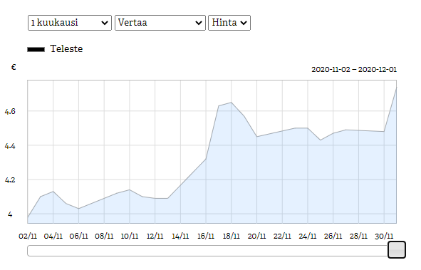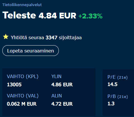 Telestehän näyttää ihan mielenkiintoiselta, tuli otettua tänään svingi 4,64€ tasolta, kun ajattelin että jatkaa nousua vielä ilta kohden, mutta ei tullut ihmeempää liikettä. Lueskelin sitten vähän enemmän yhtiöstä ja vaikuttaisi olevan suht maltillisesti hinnoiteltu ja suunta näyttäisi nyt kääntyneen. Enköhän jätä tämän salkkuun vähän pidemmäksikin aikaa. Olisikohan 5,5€ vielä ennen joulua? Tietenkin jos kokee Solteqin kohtalon, niin kohta ollaankin jo kympissä ![]()