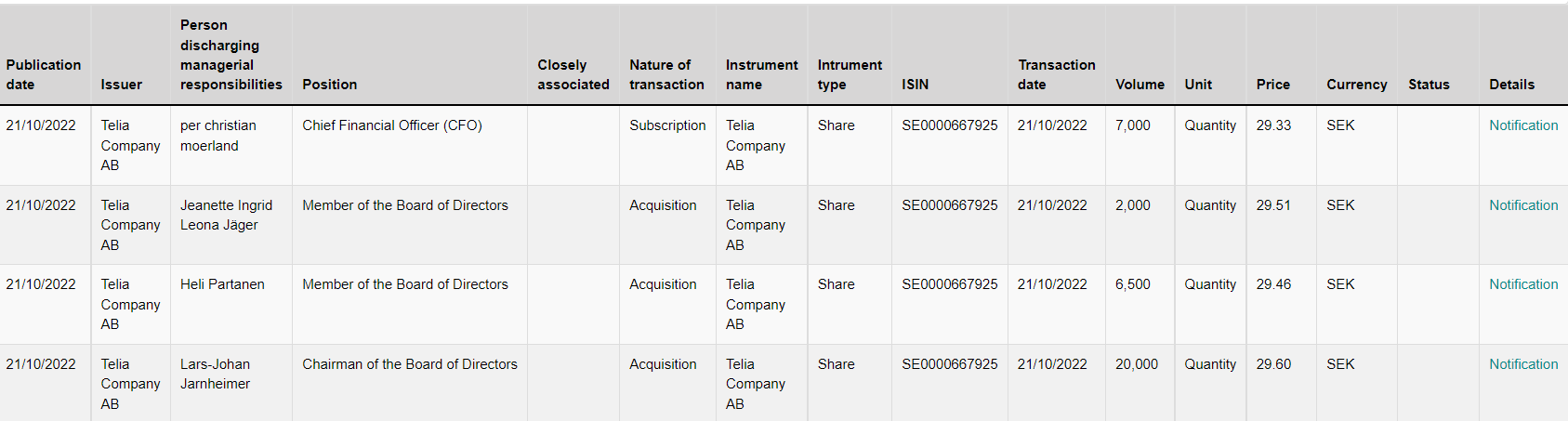 | 2022-10-23 | Telia Company AB | Jeanette Jäger | Styrelseledamot | Ja | Förvärv | Telia Company AB | Aktie | SE0000667925 | 2022-10-21 | 2 201 | Antal | 29,51 | SEK | Anmälan | |