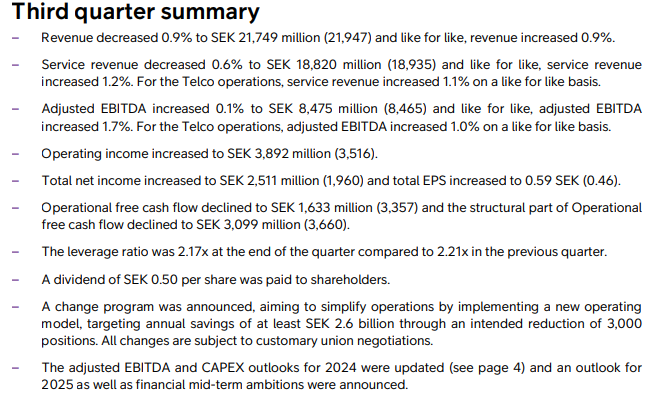 Igangsættelsen af et forandringsprogram med mål om årlige besparelser på mindst 2,6 mia. SEK blev annonceret, men programmet forventes ikke at have nogen effekt på regnskabet for 3. kvartal 2024. I stedet vil omstruktureringsomkostninger på 1,4 milliarder SEK blive bogført i 4. kvartal 2024. Desuden er den anslåede effekt på 2,6 milliarder SEK, som oplyst på investoropdateringen den 26. september, fordelt på driftsomkostninger (2,3 milliarder SEK) og CAPEX (0,3 milliarder SEK).