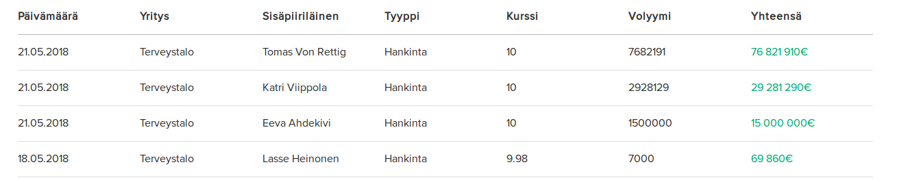 Noi hankinnat liittyy ihan puhtaasti Terveystalon listautumiseen ja sen jälkeiseen EQT:n irtautumiseen, joten noista ei voi mitään johtopäätöksiä vedellä. Eivätkä ole kuitenkaan nyt kasin pintaan lisäilleet ![]()