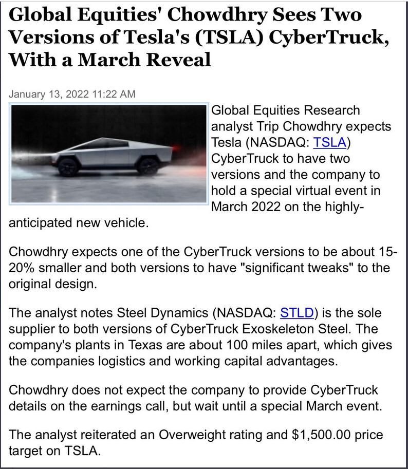 Global Equities Research analyytikko Trip Chowdhry odottaa Tesla Cybertruck:sta tulevan kaksi versiota ja Tesla pitää Maaliskuussa 2022 virtual tuo pienempi CyberTruck esitetäänpated new vehicle. Chowdhry odottaa pienmmän CyberTruckin version olevan 15-20% pienempi nykyistä CyberTruckia.