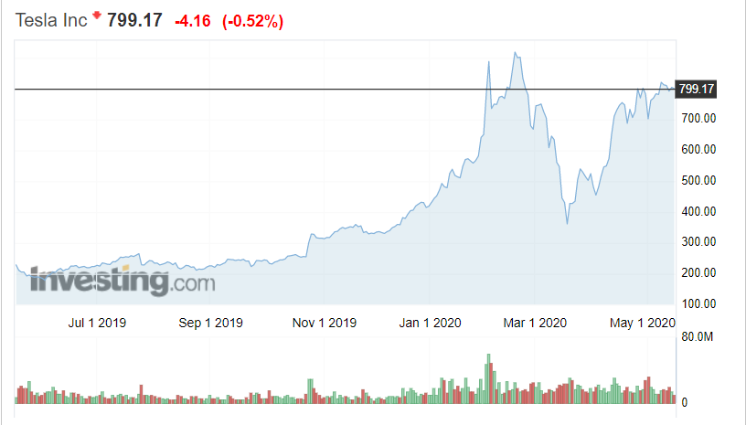 Ohessa vielä Teslan kurssidataa viimeisen vuoden ajalta ja Q1-raportti.