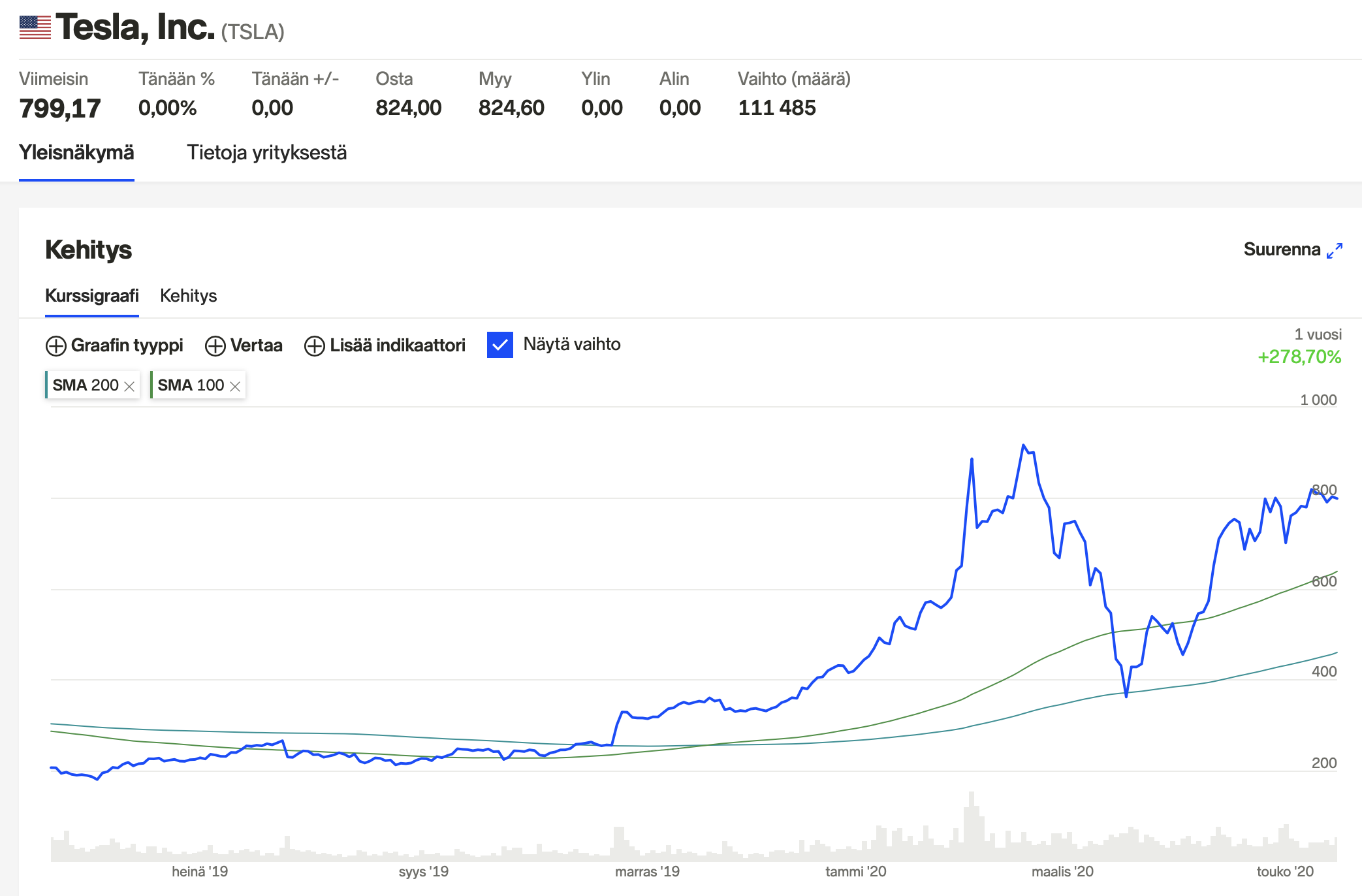 Tesla on itselleni tuttu lähinnä Sijoitustiedon ja Facebookin fanipoikien voimafantasioista. Itse en lähtisi tätä firmaa shorttaamaan tai longaamaan, koska meininki tuntuu olevan kryptovaluuttojen tavoin täysin irti reaalimaailmasta. Välillä noustaan hypen ja uutisoinnin takia, välillä dyykkaillaan Muskin twiittien takia. Jätän väliin.