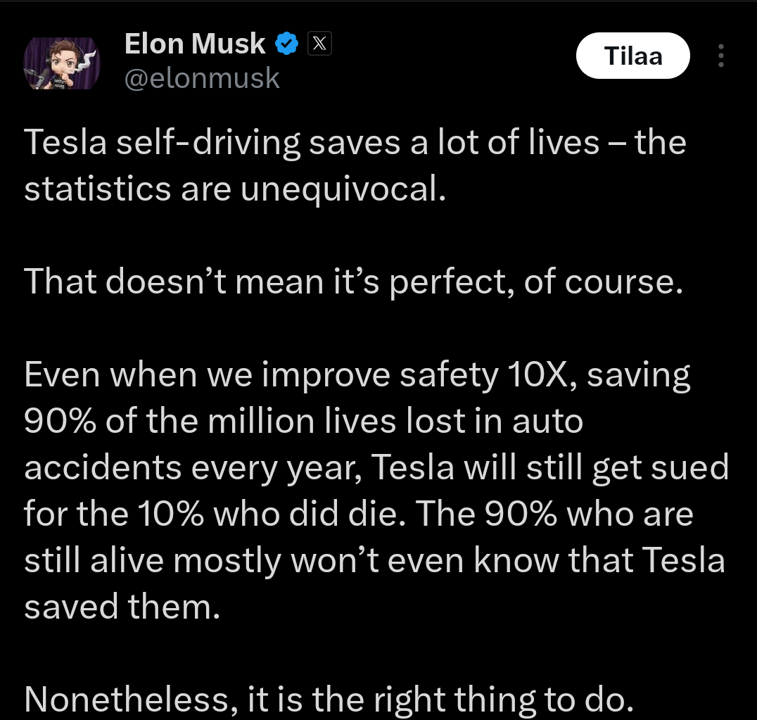 Musk ved godt, hvad spillets regler er, når det kommer til sikkerhed. Hvis Tesla klokker i det, bliver de revet i stykker, uanset hvor mange mennesker der er blevet reddet undervejs, sandsynligvis ofte uden at de selv har nogen anelse om det.
