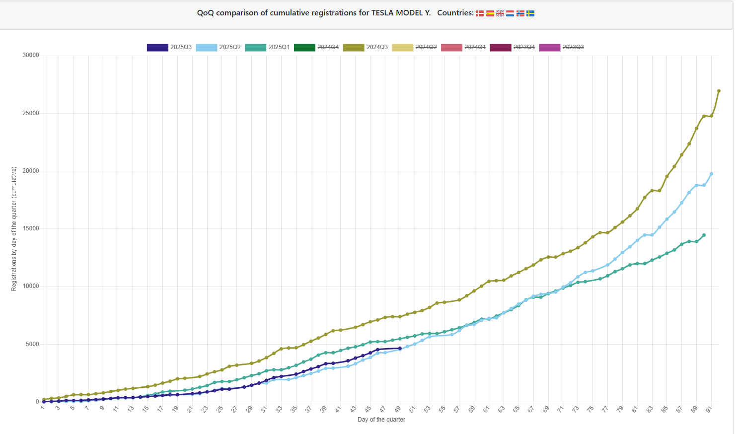 Kvarteri about puolivälissä ja tilanne näyttää tältä, Q2:n kanssa mennään tasatahtia ja nyt jännitetään tuleeko samanlainen nousu kuin kesäkuussa. Epäilen itse tätä koska kesäkuussa tuli laajalti saataville LR versiot uudesta Y:stä eli backlogia syötiin silloin.