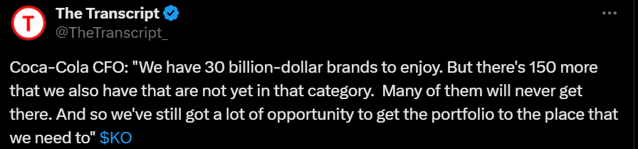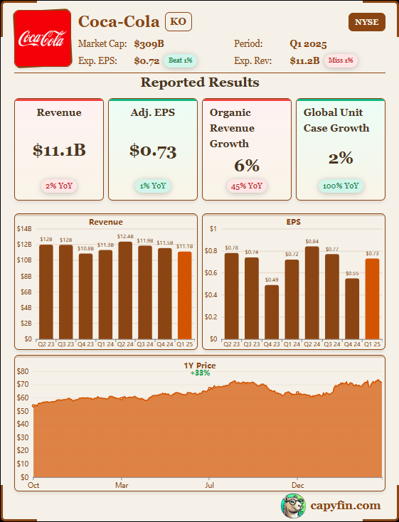 Coca-Colan vuoden ensimmäisen kvartaalin tulos oli… osin hyvä, osin huono…(ihan ok?)… oikaistu tulos ylitti odotukset, mutta liikevaihto jäi hieman ennusteista ja laski edellisvuodesta. Orgaaninen liikevaihdon kasvu oli kuitenkin vahvaa erityisesti Latinalaisessa Amerikassa ja Aasiassa. Juomamyynti kasvoi maltillisesti ja Coca-Cola Zero Sugar kasvoi erityisen kivasti. Yhtiö onnistui nostamaan myös hintoja ja paransi operatiivista kannattavuutta.