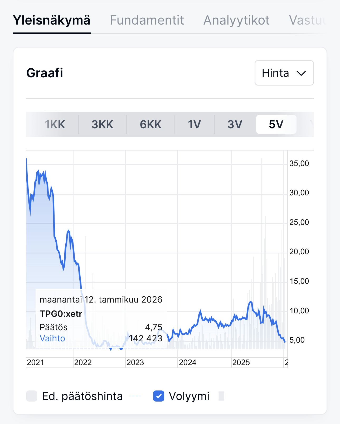 I think the data linked to the chart in Nordnet changed in connection with the latest share structure change, so the problem is on Nordnet’s end. Below is an image of the same stock in Mandatum’s service.