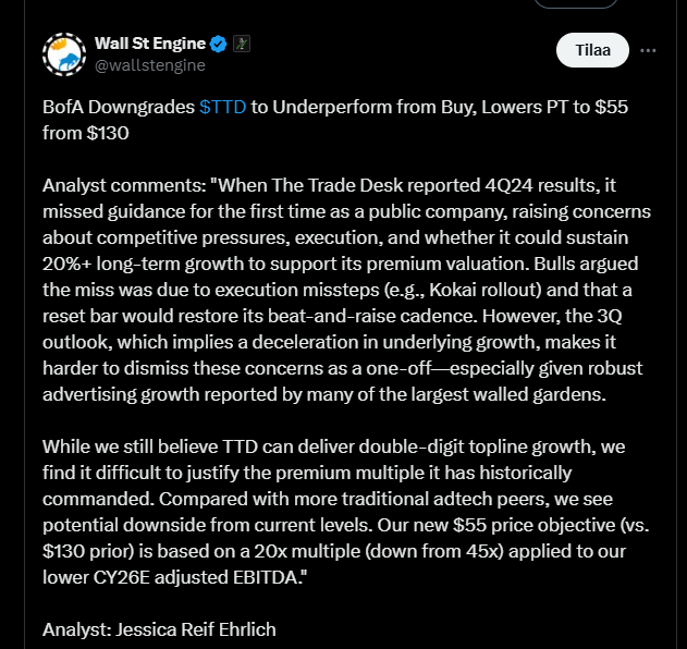 Kokonaisuutena Trade Desk tarjonnee suhteellisen houkuttelevan yhdistelmän kasvupotentiaalia, kannattavuutta ja teknologista kilpailuetua, jos trendi siirtyy edelleen pois suljetuista alustoista kohti avointa verkkoa, niin The Trade Desk voi olla yksi suurimmista voittajista “mainosrahan” uudelleenjaossa.