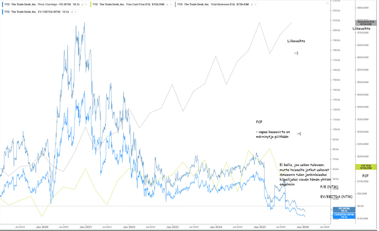Ja, Amazon er dog ikke en behagelig nyhed, og der er også andre trusler her. På den ene side føles TTD billig på en eller anden måde, og Amazon bliver måske ikke set som en helt direkte konkurrent med deres forskellige styrker; på den anden side er der en vis troværdighed i det, når kursen også dykkede, så måske er det unødig bagatellisering fra TTD-tyrenes side over for selskabets gigantiske konkurrent. Gud ved, hvad der sker, og om TTD’s nye “projekter” er af en sådan karakter, at de ender som ligegyldige eksperimenter og sygner hen. ![]()
