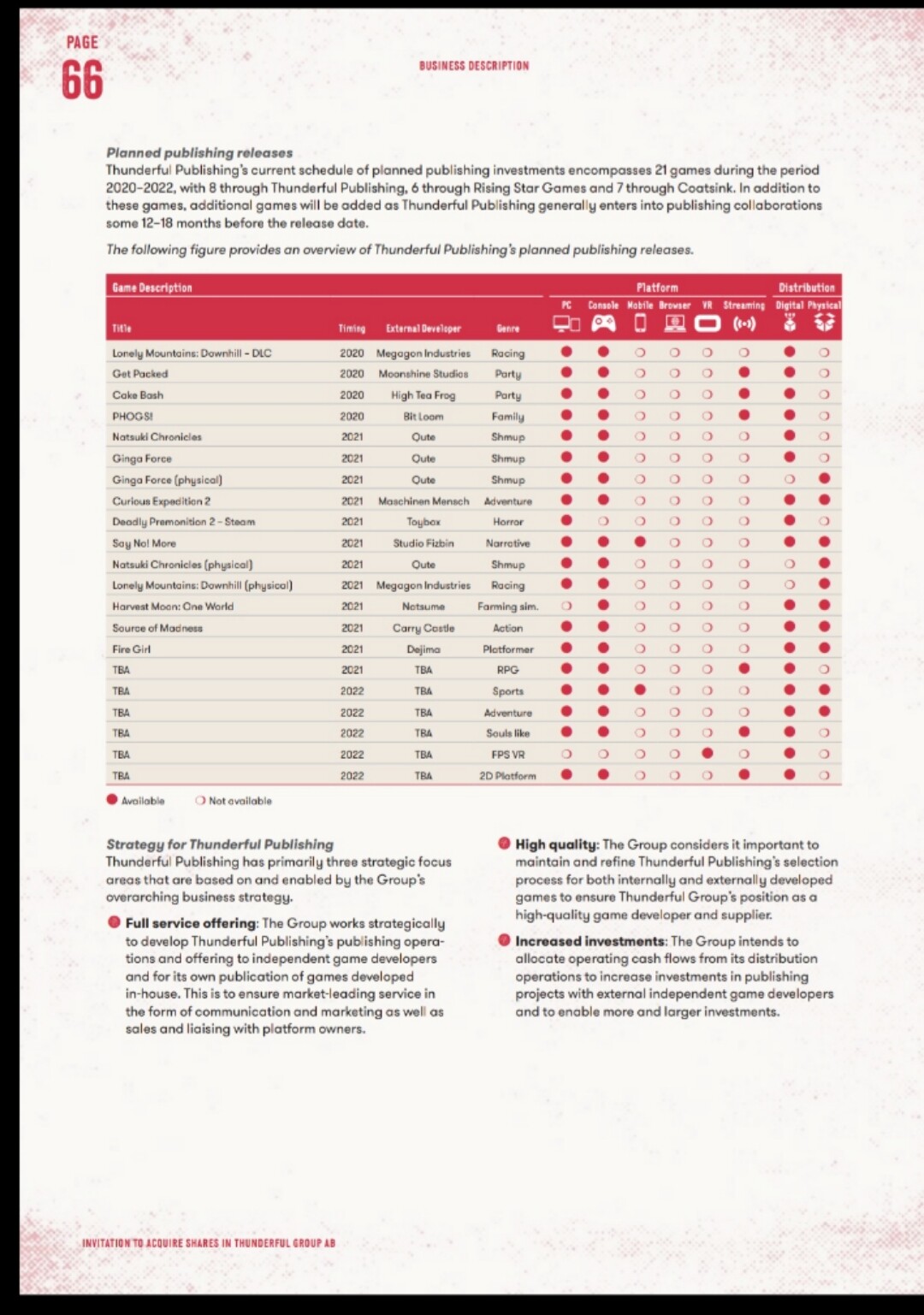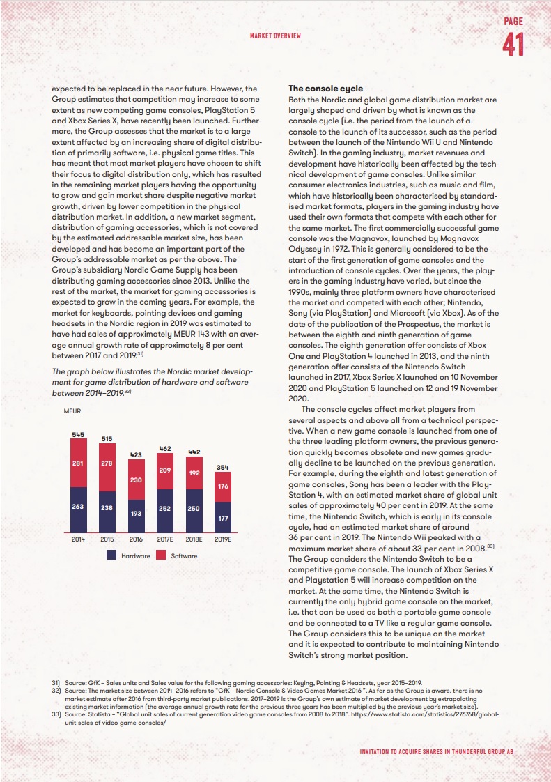 Kiinnitin huomiota tähän graafiin, jonka mukaan pelijakelu pohjoismaissa pienenisi kovaa vauhtia. Kuvan sivua edeltävältä sivulta: “The Nordic market for the game distribution of hardware and software has in recent years been characterised by negative market growth, where the market size of the Group is estimated to have decreased from approximately MEUR 545 in 2014 to approximately MEUR 354 in 2019. The market segment includes sales of hardware, mainly game consoles, and software, mainly physical game titles.” Perusteluina pääosin PS 4:n ja Xbox Onen vanheneminen, mikä olisi auttanut Bergsalaa, mutta että kilpailu kiristynee jatkossa. Ajatuksia tästä? Näköjään Thunderfulkin jakaa pelejä digitaalisesti, eli onko tämä sivun laskusuhdanne mitenkään edes relevanttia kokonaiskuvassa, jossa oletettavasti pelimarkkinat, myös Thunderfulin kentällä, lienevät kasvussa. Sivulla 35 annetut tiedot pelimarkkinoiden kasvusta ovat globaalilla skaalalla, ei vain Pohjoismaista. Sivulla 34 EMEAlle povataan vuotuista kasvua 8%, mitä siitäkin sitten voikaan päätellä.