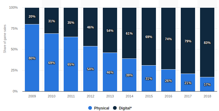 Joo, en nyt katsoisi että pitkäikäistyneiden konsolielinkaarien tai fyysisten pelipakkausten myynnillä on erityistä merkitystä markkinatrendiä tutkittaessa. PC-pelaajana en ole tainnut ostaa pelejä muuten kuin digitaalisesti yli vuosikymmeneen. Yhdysvalloissa tilanne vaikuttaa tältä vuoteen 2018 saakka: