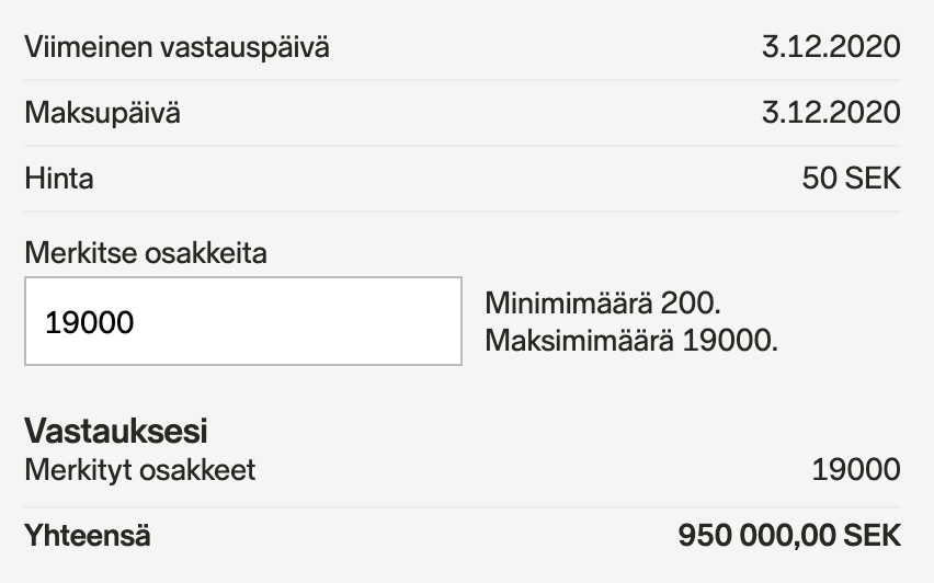 Itekki pistin vaan 5000kpl. Aina kuitenki nää ipot sen verran jänskättää, ja ku muutenki on salkussa vipua niin ei viitti pantata rahoja IPO:issa kovin isolla painolla ennen ku saan luotot tasapainotettua tavotetasolle