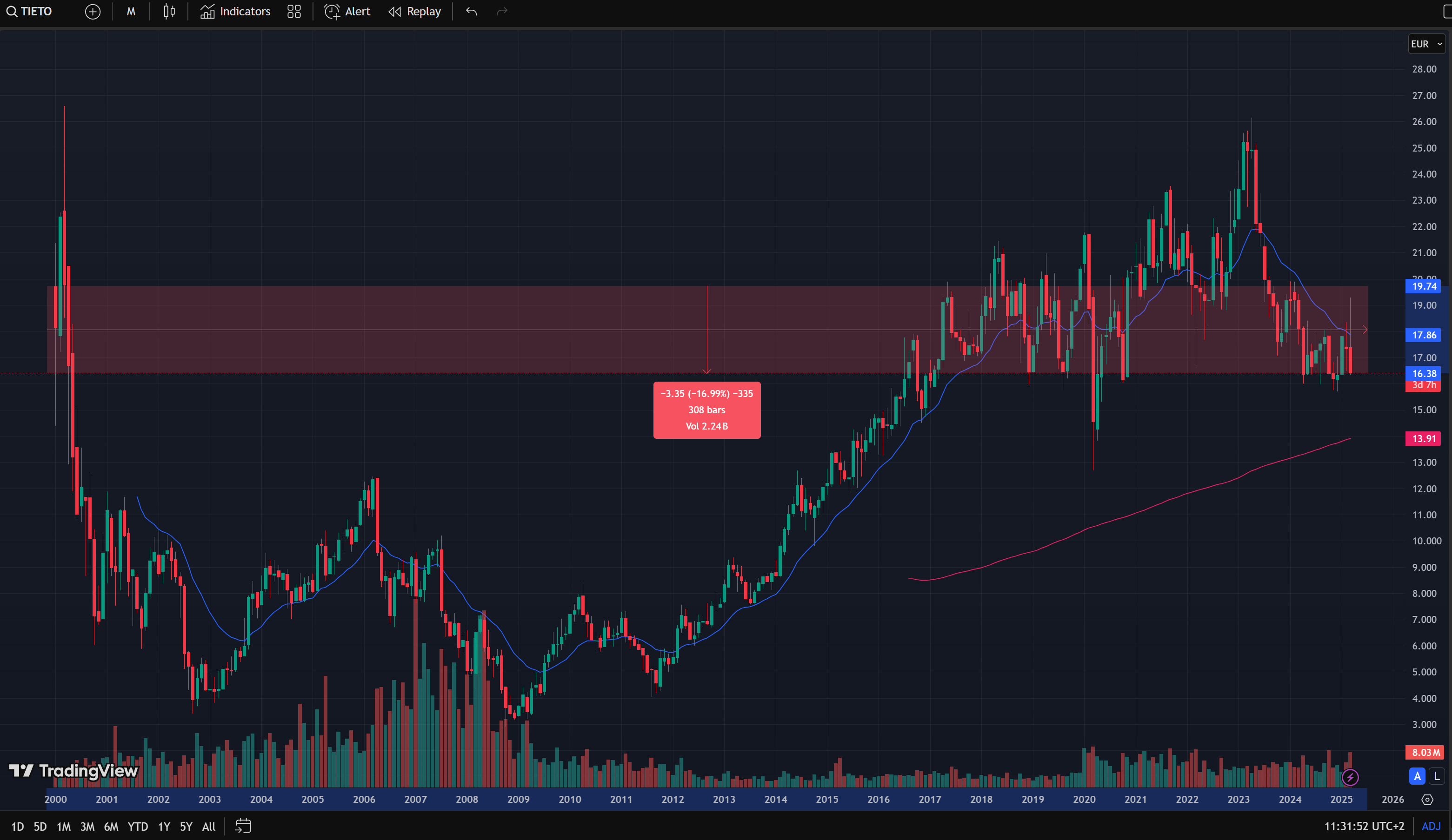 Ketjun otsikkoa kun katsoo, niin parempi voisi olla esim “Tietoevry, aliperformointia koko 2000-luvun”